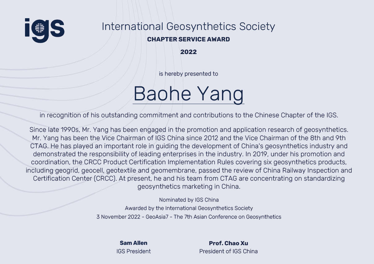 2022年11月3日,在第七届亚洲土工合成材料大会上,公司董事长杨宝和先生荣获国际土工合成材料学会分会服务奖,以表彰杨总对国际土工合成材料学会中国分会的杰出贡献。