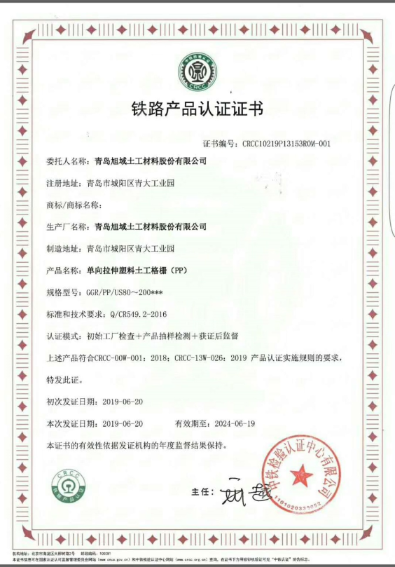 [Summary] 2019年6月28日,中铁检验认证中心(CRCC)发布了CRCC认证公告2019年第26号(总第412号),其中由中国土工合成材料工程协会(以下简称:协会)会员:“青岛旭域土工材料股份有限公司”所生产的单向拉伸塑料土工格栅(PP)和双向拉伸塑料土工格栅通过认证,成为国内首家取得拉伸塑料土工格栅“铁路产品认证证书”的生产厂家。